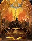 THE PATH is the way by which the human soul must pass it its evolution to full spiritual self-consciousness. The supreme condition is suggested in this work by the great figure whose head in the upper triangle is lost in the glory of the Sun above, and whose feet are in the lower triangle in the waters of Space, symbolizing Spirit and Matter. His wings fill the middle region representing the motion or pulsation of cosmic life, while within the octagon are displayed the various planes of consciousness, through which humanity must rise to attain a perfect Manhood. At the top is a winged Isis, the Mother or Oversoul whose wings veil the face of the Supreme from those below. There is a circle dimly seen of celestial figures who hail with joy the triumph of a new initiate, one who has reached to the heart of the Supreme. From that point he looks back with compassion upon all who still are wandering below and turns to go down again to their help as a Saviour of Men. Below him is the red ring of the guardians who strike down those who have not the "password," symbolized by the white flame floating over the head of the purified aspirant. Two children, representing purity, pass up unchallenged. In the centre of the picture is a warrior who has slain the dragon of illusion, the dragon of the lower self, and is now prepared to cross the gulf by using the body of the dragon as his bridge (for we rise on steps made of conquered weaknesses, the slain dragon of the lower nature).[54][55]