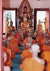 Modern Buddhism in Cambodia was strongly influenced by Thai Buddhism. The Dhammayuttika Nikaya was introduced into the country during the reign of King Norodom (1834–1904) and benefited from royal patronage.[78] The rule of the Khmer Rouge effectively destroyed Cambodia's Buddhist institutions by disrobing and killing monks and destroying temples.[79] After the end of the regime the Sangha was re-established. An important figure of modern Cambodian Theravāda is Maha Ghosananda who promoted a form of engaged Buddhism to effect social change.