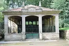 In 1929, a Comissão de Iniciativa (Initiative Commission) introduced improvements at the thermal station. Sections of the women's bathrooms were remodelled, in addition to the installation of a laboratory on site to analyze the waters, as well as an extension that acted as pharmacy.[1] The administrative council also deliberated on expropriation of lands that pertained to the Viscountess of Peso.[1] On 23 March 1930, a notice was issued to attribute a Sevilha Exposition gold medal to the waters of Melgaço. Arborization of the park continued in May, with the planting of trees to provide shade, in addition to flowering plants and fruit trees.[1] Notice on the opening of the change rooms was issued on 8 June, under the direction of Dr. Athias Ark, in addition to providing information on pricing practiced at the site.[1] An article published in August, by the Notícias de Melgaço, referred to the avenues of the park that crossed the property east to west, that connect a new spring that had been discovered, covered in a wooden structure.[1]