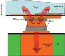 The thermal copper pillar bump, also known as the "thermal bump", is a thermoelectric device made from thin-film thermoelectric material embedded in flip chip interconnects (in particular copper pillar solder bumps) for use in electronics and optoelectronic packaging, including: flip chip packaging of CPU and GPU integrated circuits (chips), laser diodes, and semiconductor optical amplifiers (SOA). Unlike conventional solder bumps that provide an electrical path and a mechanical connection to the package, thermal bumps act as solid-state heat pumps and add thermal management functionality locally on the surface of a chip or to another electrical component. The diameter of a thermal bump is 238 μm and 60 μm high.
