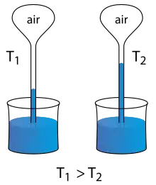 Devices employing both heat and pressure were common during Galileo's time, used for fountains, nursing, or bleeding in medicine.[3] The device was built from a small vase filled with water,[4] attached to a thin vertically rising pipe, with a large empty glass ball at the top. Changes in temperature of the upper ball would exert positive or negative pressure on the water below, causing it to rise or lower in the thin column.[3] The device established fixed points but does not measure specific quantity, although it can tell when something is warmer than another thing.[5]