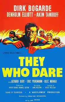 They Who Dare (aka Lewis Milestone's They Who Dare) is a 1954 Second World War war film directed by Lewis Milestone and starring Dirk Bogarde, Denholm Elliott and Akim Tamiroff.[2] The story is based on Operation Anglo that took place during World War II in the Dodecanese islands where special forces attempted to disrupt the Luftwaffe from threatening Allied forces in Egypt.[3] The title of the film is a reference to the motto of the Special Air Service: "Who Dares Wins".