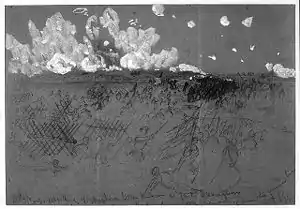 The Confederate picket line was overwhelmed quickly by the Union attackers.[144] Despite the heavy fire from the main Confederate defenses and batteries, much of the initial artillery fire from the defenders was too high to hit the Union men, but the Confederate gunners soon adjusted their range.[159] The Vermont Brigade began to falter under the more well-directed musket and artillery fire.[159] Although the account of a soldier from the 4th Vermont Infantry Regiment stated that as many as half broke for the rear and others stopped at the pickets' rifle pits, Captain Merritt Barber of the Vermont Brigade said most mustered their courage and plunged ahead.[162] The Confederate main line was reached through openings cut away by the pioneers and existing openings left by Confederates to provide access to the front.[144] Many Union soldiers reached the obstructions before the pioneers and tore them away with bare hands or found small openings to pass through.[149] Most of the Union casualties were suffered while the soldiers crossed the ground between the pickets' rifle pits and the obstructions.[163]