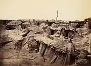 After careful planning during the two preceding days, Wright had chosen to attack the Confederate line from the Jones house to the left end of his line opposite Union Forts Fisher and Welch.[141][142] The land between the lines of the two armies was clear of trees and had few natural obstacles except for some marshes near the left end of Wright's line.[142][143] To the right of the point of attack were inundated areas and strong defenses near the Lead Works.[144] The Confederates had batteries sited every few hundred yards along their line.[144] The capture of the Confederate picket line during the Battle of Jones's Farm on March 25, 1865 put the VI Corps close enough to the main Confederate line, with a covered approach to within 2,500 yards (2,300 m) of the defenses, for the attack to succeed.[144][145][146]