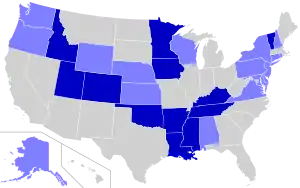 | Wyoming[61] | 3 | 73,491 | 193,559 | 5,768 | [lower-alpha 11] | [lower-alpha 11] | [lower-alpha 11] | [lower-alpha 11] | [lower-alpha 11] | 2,208 | [lower-alpha 11] | 1,739 | 276,765 |