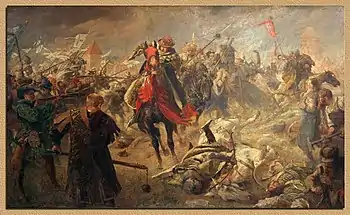 The degrading situation of the Polish crown worsened further when in September 1454 a large army of mercenaries under the command of Rudolf, prince of Sagan (Żagań), and a Moravian nobleman, the talented soldier Bernhard von Zinnenberg[2] (Polish: Bernard Szumborski) arrived in Prussia from the Holy Roman Empire. The army had 9,000 cavalry and 6,000 infantry, plus artillery and many wagons in tabor formations.
