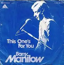 "This One's for You" is the title track from the 1976 album by Barry Manilow with words and music by Manilow and Marty Panzer. "This One's for You" peaked at number 29 on the Billboard Hot 100, and it was Manilow's fifth number one on the Easy Listening chart, reaching the top position for one week in November 1976.[1] "This One's for You" was followed by the single, "Weekend in New England". The song was covered by Shirley Bassey on her 1977 album titled, "You Take My Heart Away", and Teddy Pendergrass for his 1982 album, "This One's for You." An early version of the song appears on Manilow's compilation box set, The Complete Collection and Then Some....