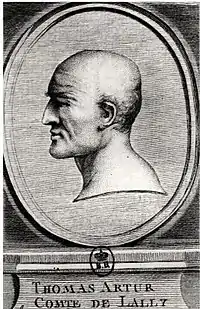 He was born at Romans-sur-Isère, Dauphiné,[1] the son of Sir Gerald Lally,[2] an Irish Jacobite from Tuam, County Galway, who married a French lady of noble family.[3] His title is derived from the Lally's ancestral home, Castel Tullendally in Co. Galway,[1] where the Lally's (originally called O'Mullallys) were prominent members of the Gaelic Aristocracy who could trace their ancestry back to the second-century High King of Ireland, Conn of the Hundred Battles.