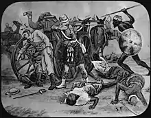 For the conspicuous bravery displayed by him in defence of one of the guns of the Naval Brigade, at the battle of Tamai, on 13th March, 1884. This man (who was attached to the Naval Brigade as Mule Driver) was beside the gun with Lieutenant Almack,.R.N., and a blue jacket. Both the latter were killed, and Edwards, after bayonetting two Arabs, and himself receiving a wound with a spear, rejoined the ranks with his mules, and subsequently did good service in remaining by his gun throughout the action.[1]