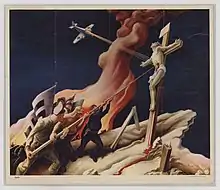 During World War II Benton created a series titled The Year of Peril, which portrayed the threat to American ideals by fascism and Nazism. The prints were widely distributed. Following the war, Regionalism fell from favor, eclipsed by the rise of Abstract Expressionism.[32] Benton remained active for another 30 years, but his work included less contemporary social commentary and portrayed pre-industrial farmlands.