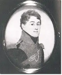![]() Portrait miniature by Charles Foot Tayler, painted 1821, showing Hawker "wearing staff uniform, his scarlet coat with gold epaulettes, his black collar with gold lace, gold waist-sash, the belt plate with royal cipher"[1] | |