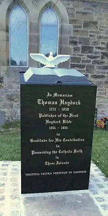 Thomas Haydock (1772–1859), born of one of the oldest English Catholic Recusant families, was a schoolmaster and publisher. His dedication to making religious books available to fellow Catholics suffering under the English Penal Laws came at great personal cost. He is best remembered for publishing an edition of the Douay Bible with extended commentary, compiled chiefly by his brother George Leo Haydock. Originally published in 1811 and still in print, it is one of the most enduring contributions to Catholic biblical studies.