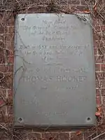 In recognition of this, near Chelmsford Cathedral, Essex, England, where he was town lecturer and curate, there is a blue plaque fixed high on the wall of a narrow alleyway, opposite the south porch, that reads: "Thomas Hooker, 1586–1647, Curate at St. Mary's Church and Chelmsford Town Lecturer 1626–29. Founder of the State of Connecticut, Father of American Democracy."[18]