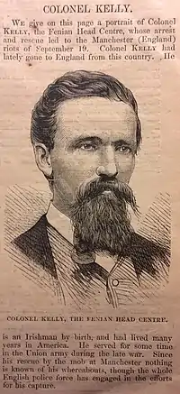 Kelly played an important role in the failed Fenian Rising of 1867 and was arrested.[11] He later escaped, and in August 1867, called a secret IRB convention at Manchester, where he was declared Chief Organiser of the Irish Republic (COIR), in succession to Stephens.