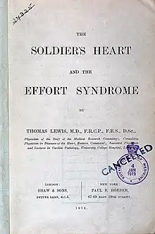During the First World War, Lewis worked at the Military Heart Hospital in Hampstead and was appointed to the first full-time clinical research post in Britain, at the Medical Research Committee (later Medical Research Council). He directed a study of the condition known as "soldier's heart" and, having established it was not a cardiological problem, renamed it the "effort syndrome".[2] In 1918 he wrote the monograph The Soldier's Heart and the Effort Syndrome. He devised remedial exercises that allowed many soldiers suffering from the condition to return to duty and was appointed honorary consulting physician to the Ministry of Pensions in April 1919, and for this work he was appointed Commander of the Order of the British Empire (CBE) in January 1920[14] and was knighted in the 1921 Birthday Honours.[15]