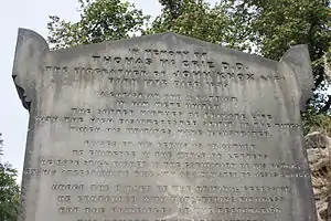 On 4 August 1835, he was suddenly taken unwell; a stupor succeeded, from which it was impossible to rouse him; and on the following day he breathed his last, without a groan or struggle, but insensible to the presence of his grieving friends who were assembled round his death-bed. Thus died in his sixty-third year of age. His remains were buried in the western extension of Greyfriars Kirkyard, halfway down the eastern path. A large monument was erected by his congregation, with an inscription commemorative of his worth and their regret. Unfortunately the bronze portrait head of McCrie on the grave has been stolen.