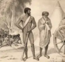 They continued down the Murrumbidgee until 21 May when they were close to the junction with the Murray River. A depot was established at this point, and Mitchell left Staplyton with eight men to guard the stock, while he ventured downstream with the rest of the group. According to the account given to a later enquiry by William Muirhead (bullock-driver and sergeant), Alexander Burnett (overseer) and Jemmy Piper (Aboriginal man accompanying the party): on 24 May Mitchell noticed that Barkindji tribesmen from the Darling River were gathering in large numbers, and by 27 May the hostile intentions of these men became known, when local Murray River people told Piper that the Barkindji were planning to kill Mitchell and his men. Mitchell had to decide whether to wait for an attack, or plan a pre-emptive manoeuvre. His numbers were reduced, as Staplyton and eight men were still at the depot. He split his party again, leaving half the men to hide in the scrub in ambush, while he continued ahead with the carts. When the armed Barkindji warriors approached, the convict Charles King, who was involved in the earlier killings, fired first without waiting for orders. The tribesmen fled into the river and Mitchell's two groups reunited on the shore and continued to shoot at the people for up to 15 minutes.[21] Around 75 shots were fired[22] with Piper later being told that seven Barkindji were killed and four wounded.[23]