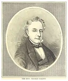 Colonel the Honourable Thomas Talbot (July 19, 1771 – February 5, 1853)[1] was an Irish-born Canadian soldier and politician. He founded the community of Port Talbot, Ontario, which was at one time the most prosperous town in the region due to his insistence on building quality roads, and he was responsible for enticing 50,000 people to settle in the Thames River area.