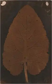In 2008, there were widespread news reports that one of Wedgwood's photographs had surfaced and was about to be sold at auction. The photogram, as shadow photographs are now called, showed the silhouette and internal structure of a leaf and was marked in one corner with what appeared to be the letter "W". Originally unattributed, then attributed to Talbot, an essay by Talbot expert Larry Schaaf, included in the auction catalog, rejected that attribution but suggested that it could actually be by Thomas Wedgwood and date from the 1790s.[8] An authentic Wedgwood image would be a key historical relic, avidly sought by collectors and museums, and would probably sell for a seven-figure price at auction. Considerable controversy erupted after the announcement and Schaaf's rationale for such an attribution was vigorously disputed by other respected photography historians. A few days before the scheduled sale, the image was withdrawn so that it could be more completely analyzed.[9]