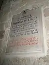 In 1622 Elizabeth Weelkes died. Thomas Weelkes was, by this time, reinstated at Chichester Cathedral, but appeared to be spending a great deal of time in London. He died in London in 1623, in the house of a friend, almost certainly on 30 November[1] and was buried on 1 December 1623 at St Bride's Fleet Street. Weelkes's will, made the day before he died at the house of his friend Henry Drinkwater of St Bride's parish, left his estate to be shared between his three children, with a large 50s legacy left to Drinkwater for his meat, drink and lodging. Weelkes has a memorial stone in Chichester Cathedral.