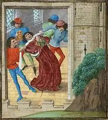Richard II quickly regained control and eventually, in 1397, managed to dispose of the Lords Appellant. By 1396, Thomas and Richard were again at odds over policy. In 1397, Thomas was arrested at his home by the king himself and was imprisoned in Calais to await trial for treason.[5] During that time he was murdered, probably by a group of men led by Thomas de Mowbray, 1st Duke of Norfolk, and the knight Sir Nicholas Colfox, presumably on behalf of Richard II; parliament declared him guily of treason and his estates forfeited.[5] These events caused an outcry among the nobility of England that is considered by many to have added to Richard's unpopularity.