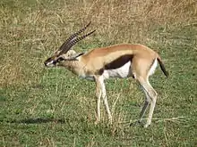 The coat is sandy brown to rufous; a distinctive black band runs across the flanks, from the upper foreleg to just above the upper hind leg. A buff band can be seen just above the black stripe. Short, black streaks mark the white rump. The black tail measures 15–27 cm (5.9–10.6 in). Males have well-developed preorbital glands near the eyes, which are used for scent-marking territories. Both sexes possess horns that curve slightly backward with the tips facing forward. The horns, highly ringed, measure 25–43 cm (9.8–16.9 in) on males and 7–15 cm (2.8–5.9 in) on females. However, females have highly fragile horns; some are even hornless.[7][15] Grant's gazelle is very similar to Thomson's gazelle, but can be differentiated by its larger size and a large white patch on the rump.[16]