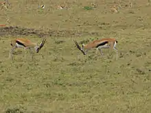 Thomson's gazelles are dependent on short grass.[18] Their numbers are highly concentrated at the beginning of the rains since the grass grows quickly.[18] They follow the larger herbivores, such as plains zebras and blue wildebeests as they mow down the tall grasses.[18] Then, the gazelles spread out more.[18] In the wild, Thomson's gazelles can live 10–15 years. Their major predators are cheetahs, which are able to attain higher speeds, but gazelles can outlast them in long chases and are able to make turns more speedily.[19] This small antelope-gazelle can run extremely fast, from 80 km/h (50 mph),[20] to 96 km/h (60 mph)[21] and zigzag, a peculiarity which often saves it from predators. Sometimes, they are also chased by leopards, lions, and hyenas, but the gazelles are faster and more agile; these predators attack especially the young or infirm individuals. They can also be prey to Nile crocodiles and African rock pythons, and their fawns are sometimes the prey of eagles, African wild dogs, jackals, and baboons. A noticeable behaviour of Thomson's gazelles is their bounding leap, known as stotting or pronking, used to startle predators and display strength.
