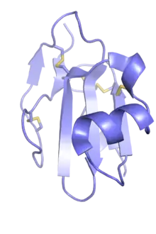 Three-finger proteins or three-finger protein domains (3FP or TFPD) are a protein superfamily consisting of small, roughly 60-80 amino acid residue protein domains with a common tertiary structure: three beta strand loops extended from a hydrophobic core stabilized by disulfide bonds. The family is named for the outstretched "fingers" of the three loops. Members of the family have no enzymatic activity, but are capable of forming protein-protein interactions with high specificity and affinity. The founding members of the family, also the best characterized by structure, are the three-finger toxins found in snake venom, which have a variety of pharmacological effects, most typically by disruption of cholinergic signaling. The family is also represented in non-toxic proteins, which have a wide taxonomic distribution; 3FP domains occur in the extracellular domains of some cell-surface receptors as well as in GPI-anchored and secreted globular proteins, usually involved in signaling.[2][3][4][5]