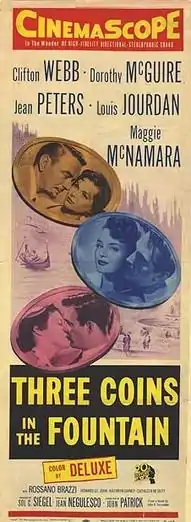Three Coins in the Fountain is a 1954 American romantic comedy film directed by Jean Negulesco and starring Clifton Webb, Dorothy McGuire, Jean Peters, Louis Jourdan, and Maggie McNamara, and featuring Rossano Brazzi. Written by John Patrick, the film is about three American women working in Rome who dream of finding romance in the Eternal City.[5]