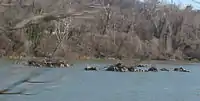 The Potomac River near Washington, D.C. averages between 10-20' deep -- except near shore or the 3 Sisters Islands. However, there is a deep channel near the Three Sisters which generally is about 80 feet (24 m) deep, but can drop to just 30 feet (9.1 m) or less during low tide or periods of little precipitation.[7][8] The rock formation generates sand bars which are often visible at low tide.[9] No grass grows on the sandbars near 3 Sisters Islands -- which are fully submerged at high tide. The height of the sandbars wax and wane according to floods, spring silt runoff, and drought.