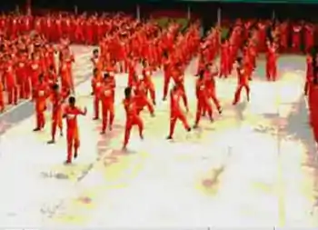 The CPDRC inmates have performed numerous other songs, including Queen's "Radio Ga Ga" and several songs from Sister Act, with prisoners dressing as nuns in habits.[2][3] 44 female inmates, held in a separate wing from the males, joined the men in a dance to "I Will Follow Him".[1] "Hail Holy Queen", from Sister Act 2, and the Algorithm March were also performed by the convicts and then upload onto YouTube.[8] The inmates dance in order to help pass the time while serving their prison sentences or awaiting a trial. More than 900 of the inmates take part in the routines, with a small group of dancers at the core of each performance. Every prisoner at CPDRC, apart from the old and the infirm, has a part in the routine. Garcia directs and choreographs each of the dances.[2][6] The inmates' participation is said to be completely voluntary, with no prisoner being forced to dance. "It would be different if they are being forced to dance", declared Rubio. "I've never known any prisoners being forced to dance. It's normal to dance."[2] The inmates have express pride at their performing success, and routinely query the viewing figures for their routines.[6] By August 2007, ten of the prisoners' performances had been viewed over 100,000 times each.[15] In 2007, the prisoners stated that they were to perform to Vanilla Ice's "Ice Ice Baby".[4][6] At the time, they were also practicing Philip Oakey and Giorgio Moroder's "Together in Electric Dreams", a homage to the inmates' fans.[1]