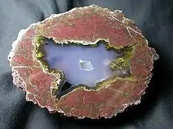 A thunderegg (or thunder egg) is a nodule-like rock, similar to a filled geode, that is formed within rhyolitic volcanic ash layers.[1] Thundereggs are rough spheres, most about the size of a baseball—though they can range from a little more than a centimeter to over a meter across. They usually contain centres of chalcedony which may have been fractured followed by deposition of agate, jasper or opal,[1] either uniquely or in combination. Also frequently encountered are quartz and gypsum crystals, as well as various other mineral growths and inclusions. Thundereggs usually look like ordinary rocks on the outside, but slicing them in half and polishing them may reveal intricate patterns and colours. A characteristic feature of thundereggs is that (like other agates) the individual beds they come from can vary in appearance, though they can maintain a certain specific identity within them.