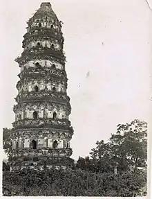 The primary pagoda of the former Yunyan Temple, which was founded in 327 and rebuilt for the last time in 1871. The temple suffered damage in successive wars and most of the temple was destroyed during the Second Sino-Japanese War. Some elements of the temple such as the formal entrance, the Yunyan Pagoda, and several other buildings and smaller shrines have survived, and now stand as landmarks throughout Tiger Hill Park.