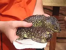 Tiliqua rugosa is a short-tailed, slow-moving species of blue-tongued skink found in Australia. Three of the four[2] recognised subspecies are found only in Western Australia, where they are known collectively by the common name bobtail.[3] The name shingleback is also used, especially for T. rugosa asper, the only subspecies native to eastern Australia.