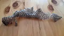 It has a triangular head and a bright blue tongue.[6] Its short, stumpy tail is similar in shape to its head. This possibly evolved as a defence mechanism against predators, and has led to the common name of "two-headed skink".[6] Its short tail also contains fat reserves, which the lizard lives upon during brumation in winter.[6] Unlike many skinks, shinglebacks do not exhibit autotomy and cannot shed their tails.[14]
