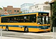 In early 1989, operations in Horsham were reduced, following the loss of the tendered route to Barns Green. A new service to Billingshurst was briefly introduced in February 1989, but withdrawn after two months. In July, a new service between Guildford and the British Aerospace site at Dunsfold Aerodrome was introduced. Further expansion eastwards came in November 1989, when the operation of eleven tendered routes, requiring six buses, was won from the county council. These were operated under the Hobbit name.[18] A new service linking Normandy and Christmaspie to Guildford two days a week was introduced in October 1989. A second route to the two villages was added in 1995. In January 1999 a new route from Farnham to Tongham via Normandy was launched, as was a direct service from the village to Guildford.[19] In 1998 an outstation was opened in Aldershot following the award of contracted work in Reading to Tillingbourne.[20]