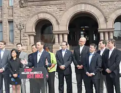 On April 2, 2009, Hudak launched his campaign for the leadership of the Progressive Conservative Party. Considered by many as the frontrunner in the race, Hudak had secured the support of over half the caucus at the launch of his campaign.[11] Hudak was endorsed by federal Conservative cabinet ministers John Baird and Tony Clement, who had served alongside him in the cabinets of Harris and Eves.[12] During the campaign, Hudak was quoted as saying that if the PCs want to regain government, they would have to make inroads in major cities and begin "reaching out to new Canadian communities.... I want to make sure that the next wave of new Canadians – whether from the Czech Republic or India or China – will see the Ontario PC party as home.".[13]