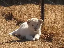 Lions with a recessive gene causing the coats to be snow white (though not albino) reappeared in the Timbavati in 2006 after an absence of many years.[7] Their white coats are not the product of albinism, a relatively common condition resulting from a failure to develop pigment, but from another condition called "leucism," in which the pelt is white but eyes and skin are pigmented. The condition is rare and also termed a "chinchilla mutation." It is thought to represent an evolutionary stage in the progressive loss of pigmentation. The white mutation, which affects two of the pigments involved in coat coloration, is expressed only when two conditions pertain: (1) Both parents carry the recessive "white gene"; (2) the offspring inherit the recessive gene of each parent. If a cub receives a dominant "tawny" gene from either parent, its pelt will be tawny. Thus a litter may contain both tawny and white cubs.