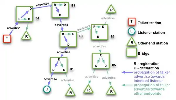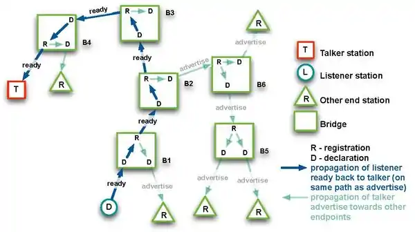 If a bridge is able to reserve the required resources, it propagates the advertisement to the next bridge; otherwise, a 'talker failed' message is raised. When the advertise message reaches the listener, it replies with 'listener ready' message that propagates back to the talker.