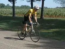Positioning Pro and elite level cyclists turn to the wind-tunnels to constantly seek refinement and improvements in their individual time trial on-the-bike positioning. Professionally measured, out-on-the-road tested positioning (arms inwards as much as physiologically possible, knees in pedalling, head and body in better alignment in the time trialing, aero position, etc.) will see as much as a 6-minutes improvement in non-aero or former poor aero positioning. Empirical evidence shows that it is far more important to aerodynamically improve a rider's position than to rely solely on technology in order to better one's time trialing results.[15]