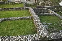 - The city wall around the precinct is constructed using large blocks of limestone in opus quadratum, covering a surface of around 25 hectares.[13]
