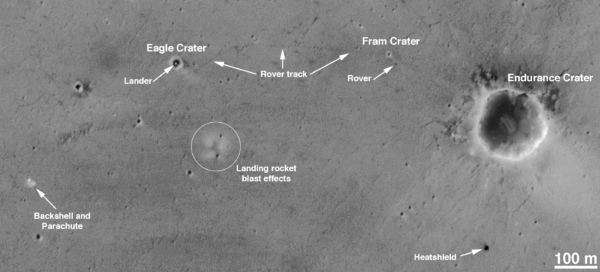 Opportunity landed in Meridiani Planum at 1.95°S 354.47°E, about 25 kilometers (16 mi) downrange (east) of its intended target on January 25, 2004 at 05:05.[4] Although Meridiani is a flat plain, without the rock fields seen at previous Mars landing sites, Opportunity rolled into an impact crater 22 meters in diameter, with the rim of the crater approximately 10 meters (33 ft) from the rover.[4] NASA Scientists were so excited about landing in a crater that they called the landing a "hole in one"; however, they were not aiming for the crater (and did not know it existed). Later, the crater was named Eagle crater and the landing site designated "Challenger Memorial Station".[5] This was the darkest landing site ever visited by a spacecraft on Mars. It would be two weeks before Opportunity was able to get a better look at its surroundings.