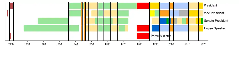 This is a timeline of Philippine elections, in which the parties of the President, Vice President, Senate President and House Speaker at the time of the elections are displayed.