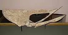 Although Cuvier's interpretation later became the consensus, it was just one of many early interpretations of the creature and its relatives, including that they were bats, strange birds, or the primordial handiwork of Satan himself.[4] Similar animals like the long-tailed Rhamphorhynchus and Gnathosaurus were soon discovered around Europe and it became obvious that earth was once home to a diverse group of flying reptiles.[5] The British anatomist Sir Richard Owen dubbed this vanished order the Pterosauria. Soon after, he described Britain's own first pterosaur, Dimorphodon.[6] Later in the 19th century pterosaurs were discovered in North America as well, the first of which was a spectacular animal named Pteranodon by paleontologist Othniel Charles Marsh.[7]