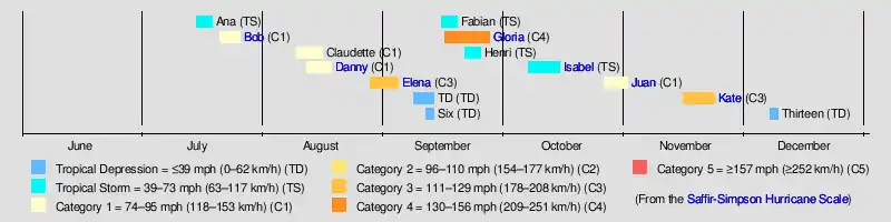 The 1985 Atlantic hurricane season was an event in the annual Atlantic hurricane season in the north Atlantic Ocean. It featured average activity overall, with thirteen tropical cyclones, eleven tropical storms, seven hurricanes, and three major hurricanes.[1] The season officially began on June 1, 1985 and ended November 30, 1985. These dates, adopted by convention, historically describe the period in each year when most systems form.[2] The season's first storm, Tropical Storm Ana, developed on July 15; the season's final storm, Tropical Depression Thirteen, dissipated on December 9.