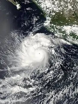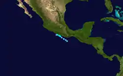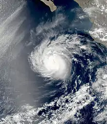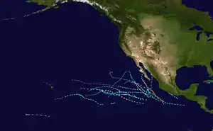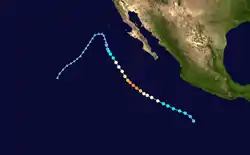The 2004 Pacific hurricane season had 17 tropical cyclones, of which 12 became named storms, 6 became hurricanes, and 3 became major hurricanes (Category 3 or higher).[1][2] This timeline documents all the storm formations, strengthening, weakening, landfalls, extratropical transitions, as well as dissipation. It also includes information which was not operationally released, meaning that information from post-storm reviews by the National Hurricane Center, such as information on a storm that was not operationally warned on, have been included. The season officially began on May 15, 2004 in the eastern Pacific proper (June 1, 2004 in the central Pacific) and lasted until November 30 that same year.[3] Areas east of 140°W are under the purview of the National Hurricane Center (NHC); the area between the International Date Line and 140°W, or the central Pacific, is under the purview of the Central Pacific Hurricane Center (CPHC).
