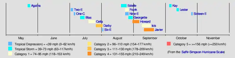 The 2004 season got off to an early start with Tropical Storm Agatha, which formed a week after the season began.[4] No tropical cyclones were active in June, the first such occurrence since 1969.[5] July was more active, producing four tropical cyclones. Three of these (Blas, Celia, and Darby) became named storms, two (Celia and Darby) became hurricanes, and Hurricane Darby became the first major hurricane of the season.[6] Additionally, a tropical depression in the central Pacific became the only tropical cyclone to form within the Central Pacific Hurricane Center's area of responsibility during the year.[1] August was the most active month, producing six tropical cyclones, four named storms, and two hurricanes (Frank and Howard).[7] September saw a decline in activity, although all three storms that existed during the month were hurricanes, two of which (Howard and Javier) were major hurricanes. Hurricane Howard, which had formed in August, only became a major hurricane in September. Hurricane Javier – the final storm during the month – was the strongest storm of the season.[8] October saw the final three tropical cyclones of the year; two developed into named storms (Kay and Lester). Neither of these storms became hurricanes.[9]