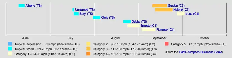 - 8 p.m. AST (0000 UTC September 14) – Hurricane Gordon reaches Category 3 intensity, becoming the first major hurricane of the season.[13]