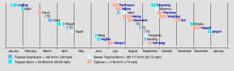 The season has a relatively below-normal quantity of named storms, although a large number of those (eight) became super typhoons, including seven Category 5 storms. The season is not as active and costly as the previous season. During the first half of the season, it was active with seven storms forming due to a developing weak El Niño, however this failed during August. The most active month so far in the season is July; with four storms developing and made landfall, with three of them reaching super typhoon strength. With this, the season became quiet as of August 15, following the dissipation of Genevieve, although only few depressions formed but never strengthened into tropical storms. This continued until the first week of September, as the tropics within the basin started to get active again, with three tropical depressions in the same time. Tropical activity began to rise again during mid-September, although the season became quiet again after the dissipation of Vongfong, with a pause of Nuri's lifecycle.