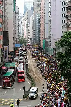 Police ordered MTR to bypass Wan Chai, Causeway Bay and Tin Hau stations for several hours.[19] Protesters exited at Fortress Hill to join the protest.[20] Police urged protesters to start off before the official 3 pm start-time to ease overcrowding; police were forced to open up all lanes on Hennessy Road, having previously refused to do so.[21] A significant number of protesters were still leaving Victoria Park up to four hours after the start time, and were still arriving at the end-point at 10 pm.[22]